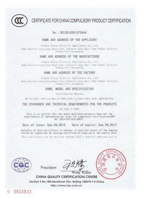 配电箱 XM250A 英文证